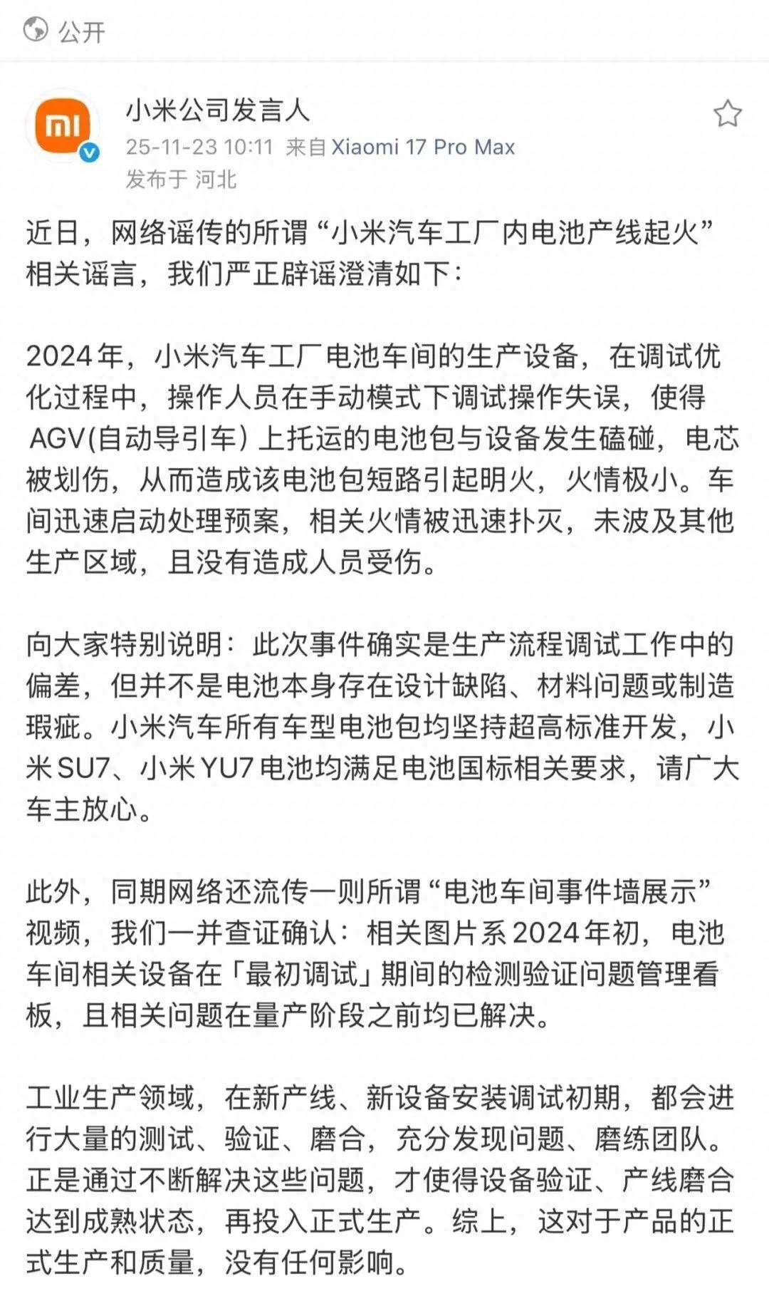 向大家特别说明:此次事件确实是生产流程调试工作中的偏差,但并不是电池本身存在设计缺陷、材料问题或制造瑕疵。小米汽车所有车型电池包均坚持超高标准开发,小米SU7、小米YU7电池均满足电池国标相关要求,请广大车主放心。