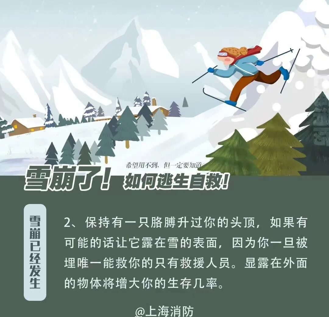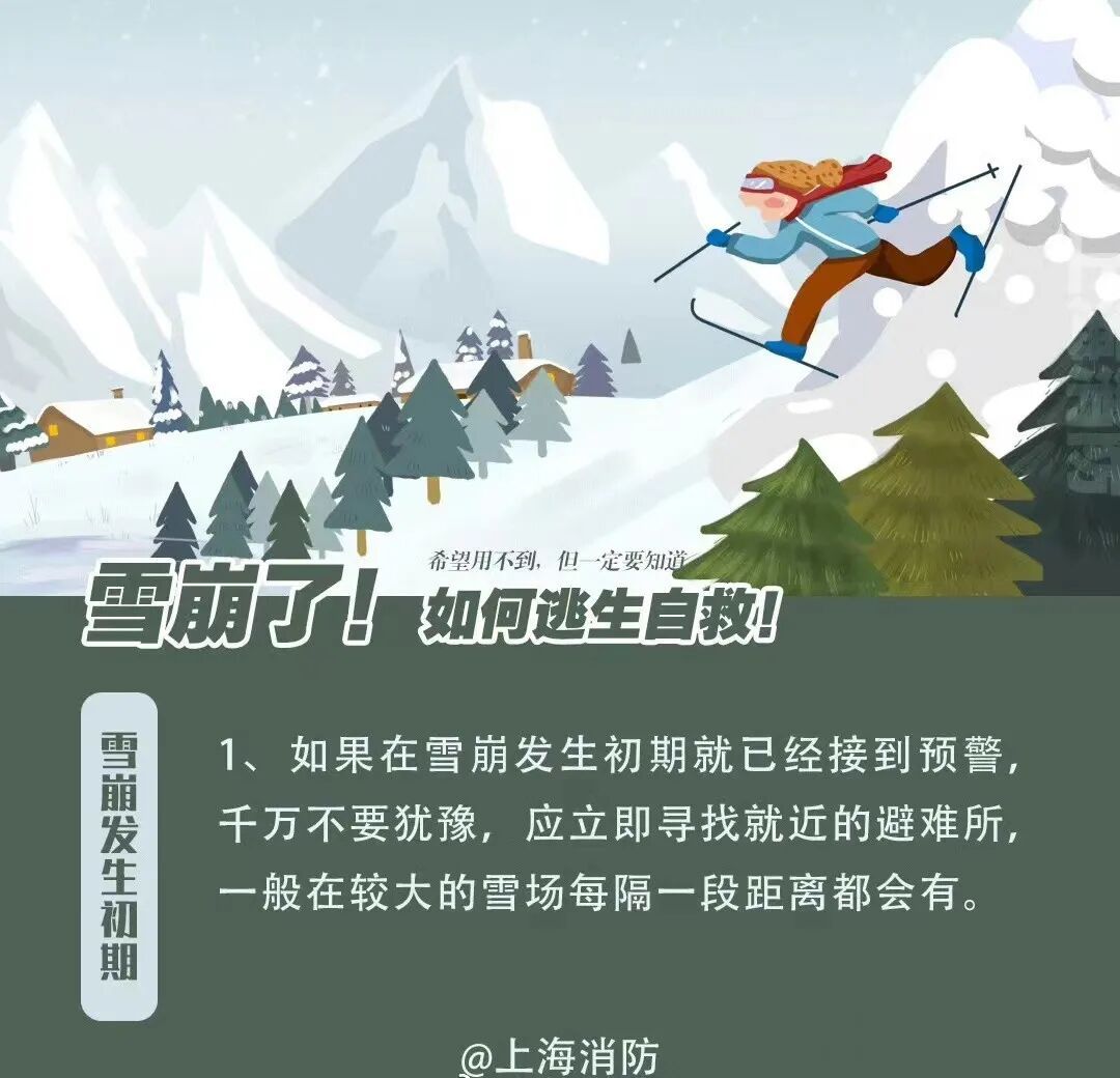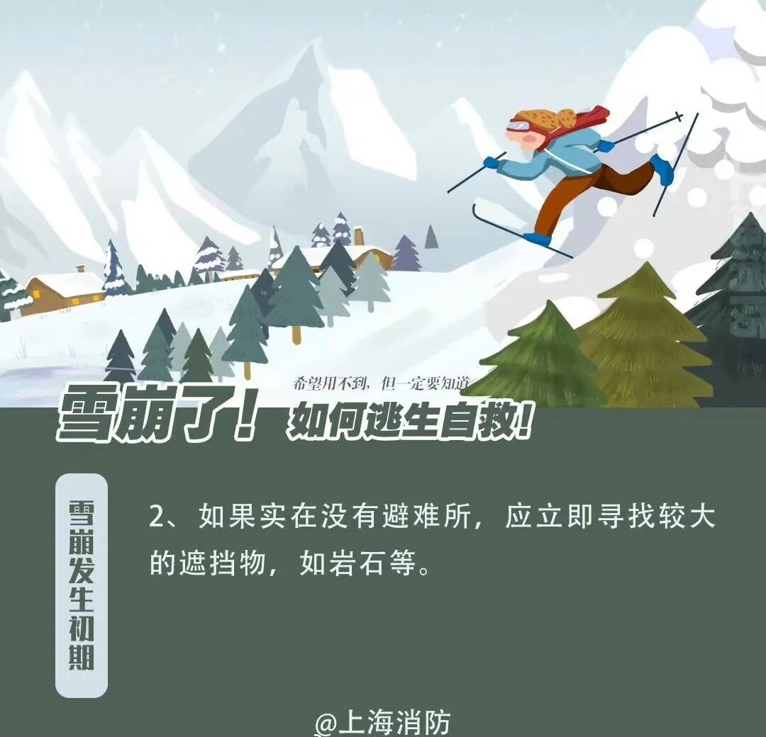 避免雪崩造成人身伤害,重在防患于未然。通过对地形和降雪量的判断,在经过路线中有可能形成雪崩的区域要格外小心行走。能避开则避开,不能避开的则要选择合适的时间通过。
