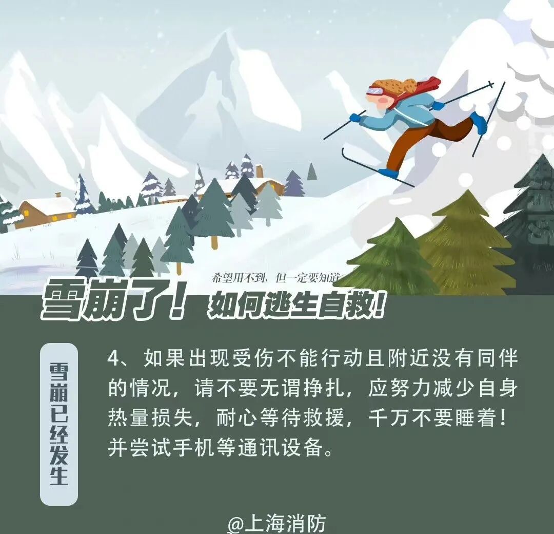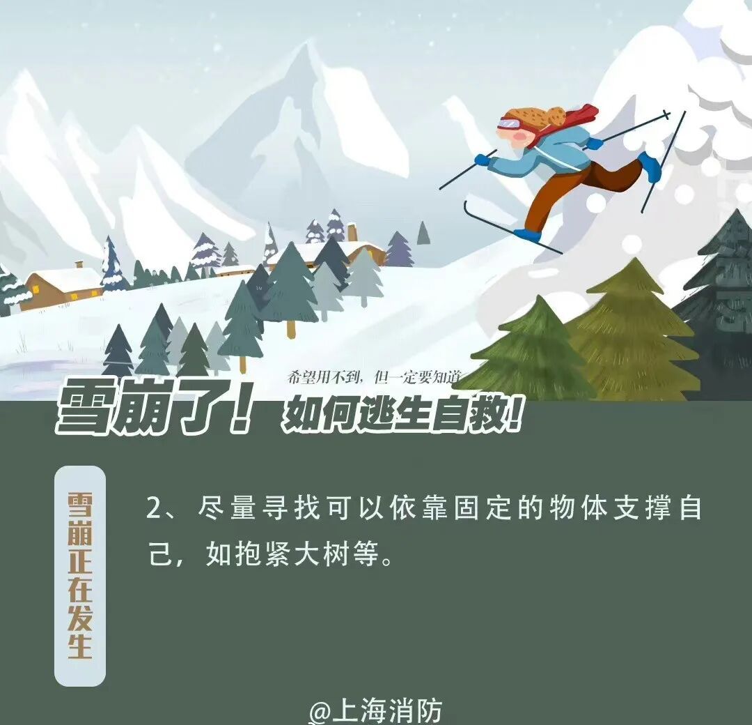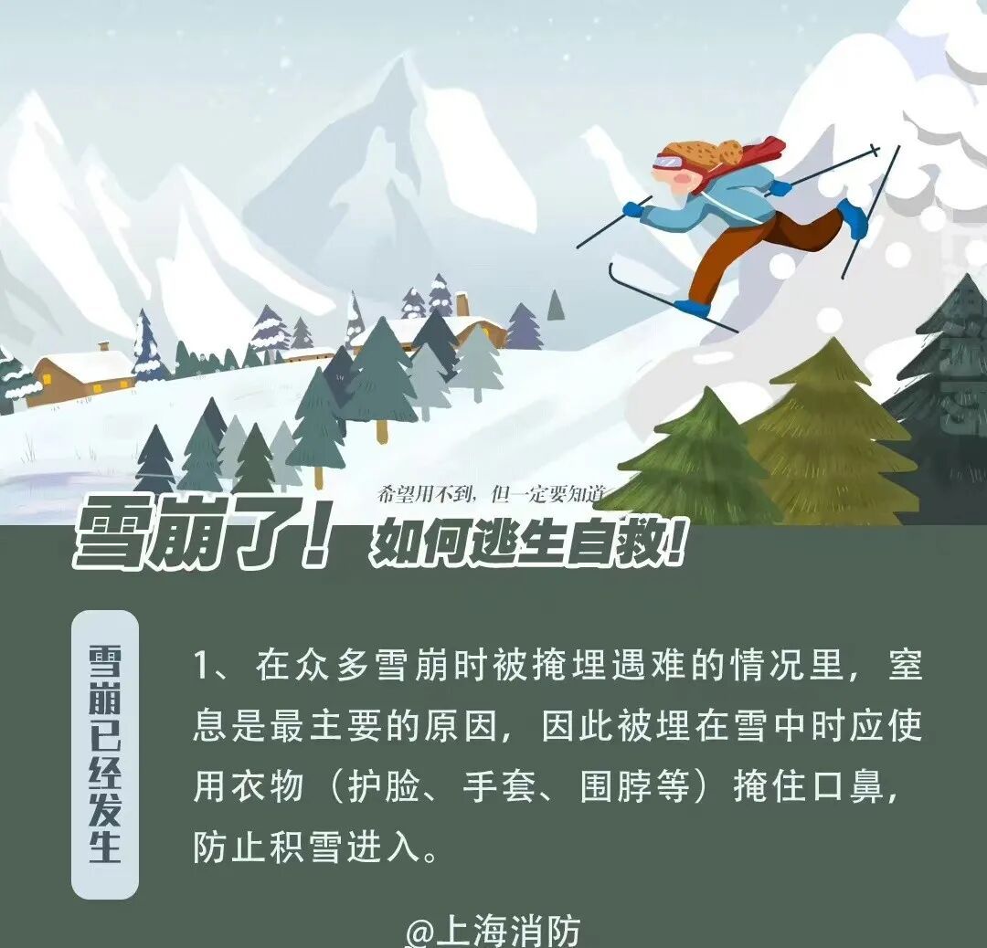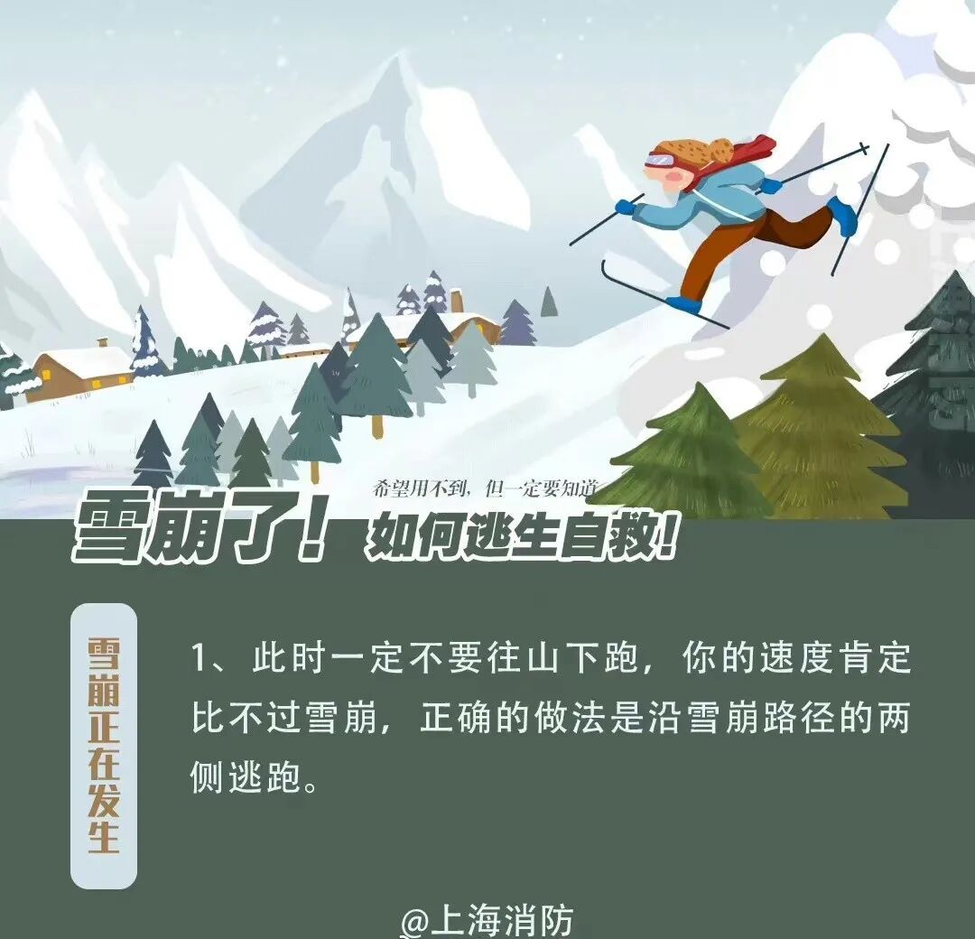 避免雪崩造成人身伤害,重在防患于未然。通过对地形和降雪量的判断,在经过路线中有可能形成雪崩的区域要格外小心行走。能避开则避开,不能避开的则要选择合适的时间通过。